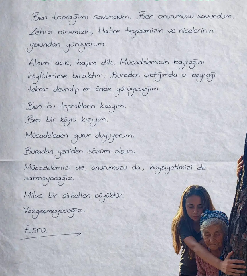Halk direnerek topraklarını savunurken İkizköy Mahalle Muhtarı Nejla Işık’ın kızı Esra Işık da bulunuyordu. Kameralara karşı yaptığı konuşmalar halkın desteğini toplayınca 5’li çetenin oluşanlarından LİMAK Holding’e talan ettirmekten başka bir derdi olmayan AKP’nin halk düşmanı yargısı Esra Işık’ı tutukladı.