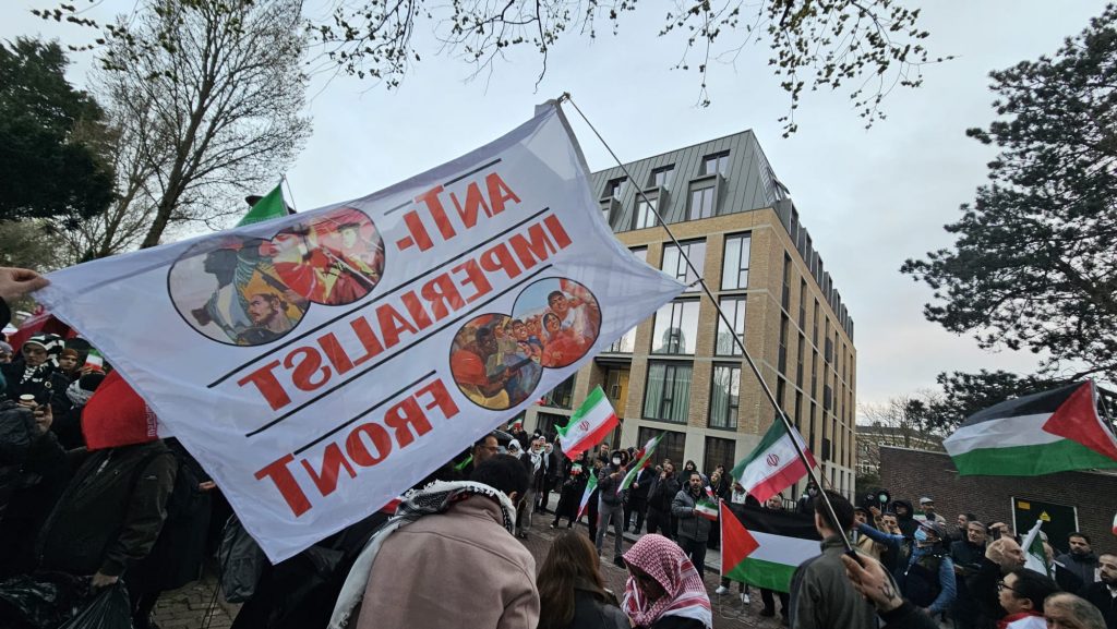 Büyükelçilik kapısı önünde üzerinde “Dünya halklarının baş düşmanı ABD ve Siyonist işgalcilere karşı direnen İran’ı selamlıyoruz. İran Halkı Yalnız Değildir.” yazan bir pankart açıldı.