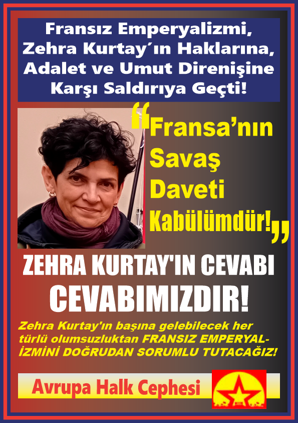 Ve; süresiz açlık grevinin 6’ncı ayında 38 kiloya düşen Zehra Kurtay’ın başına gelebilecek her türlü olumsuzluktan FRANSIZ EMPERYALİZMİNİ DOĞRUDAN SORUMLU TUTACAĞIZ!