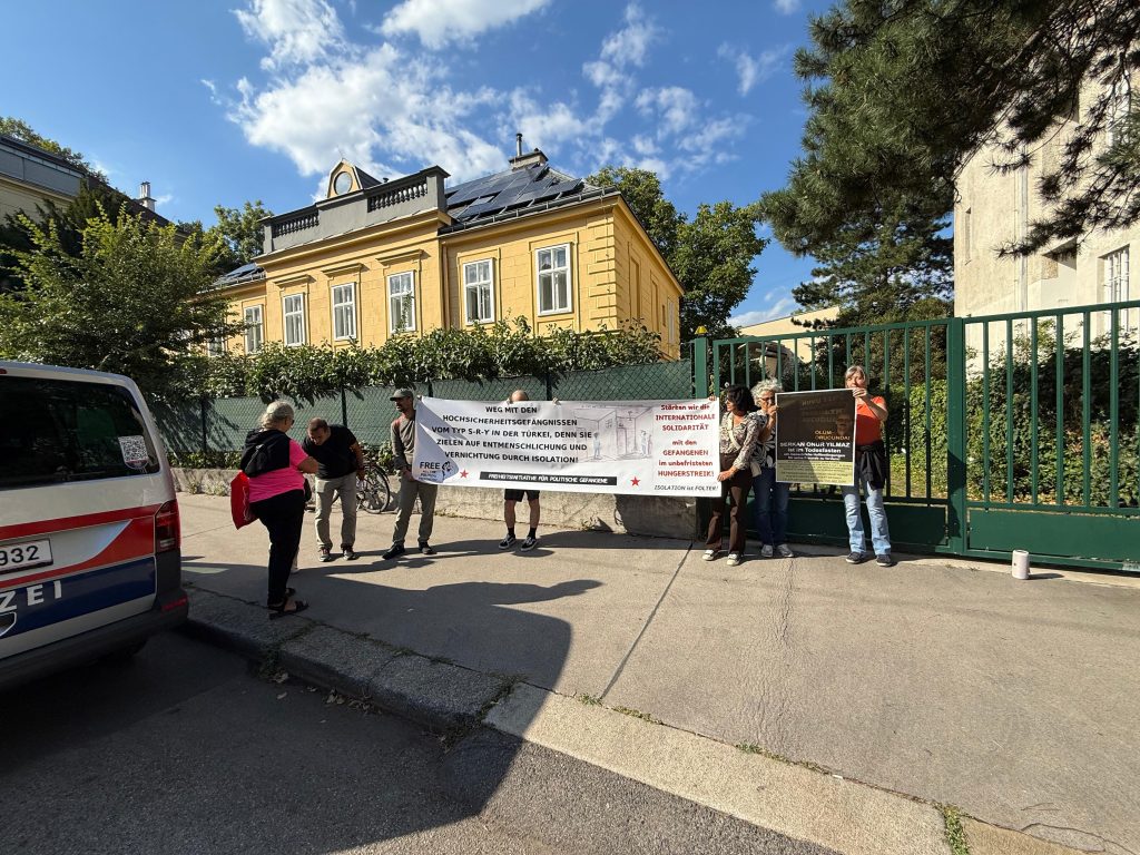 22 Ağustos Cuma Günü S,R,Y, Kuyu Tipi Hapishanelere Karşı Serkan Onur YILMAZ’ın Ölüm Orucu Direnişinin 285. Günü ve 9 Siyasi Tutsağın Süresiz Açlık Grevi Direnişlerini Sahiplenmek için Viyana Türkiye Konsolosluğu önünde protesto eylemi düzenlendi…