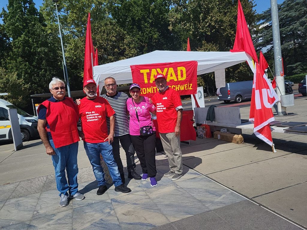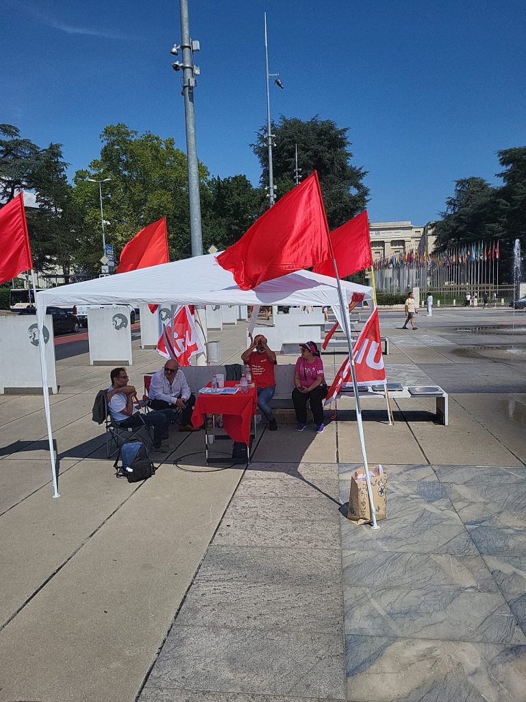 Lozan Unia sendikasından emekçiler, bayrakları ve baskılı tişörtleriyle birleşmiş milletler önündeki çadırı ziyaret ettiler ve direnişi desteklediklerini belirttiler.