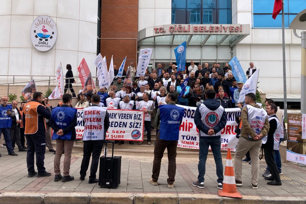 Çiğli Belediyesinde çalışan kamu emekçileri, ödenmeyen toplu iş sözleşmesi (TİS) alacakları nedeniyle eylemde olduklarını, haklarını alıncaya kadar da eylemi sürdüreceklerini belirttiler.