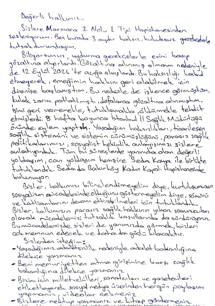 Sizlere Marmara 2 No’lu L Tipi Hapishanesi’nden sesleniyorum. Ben burada üç aydır haksız, hukuksuz gerekçelerle tutsak durumdayım.