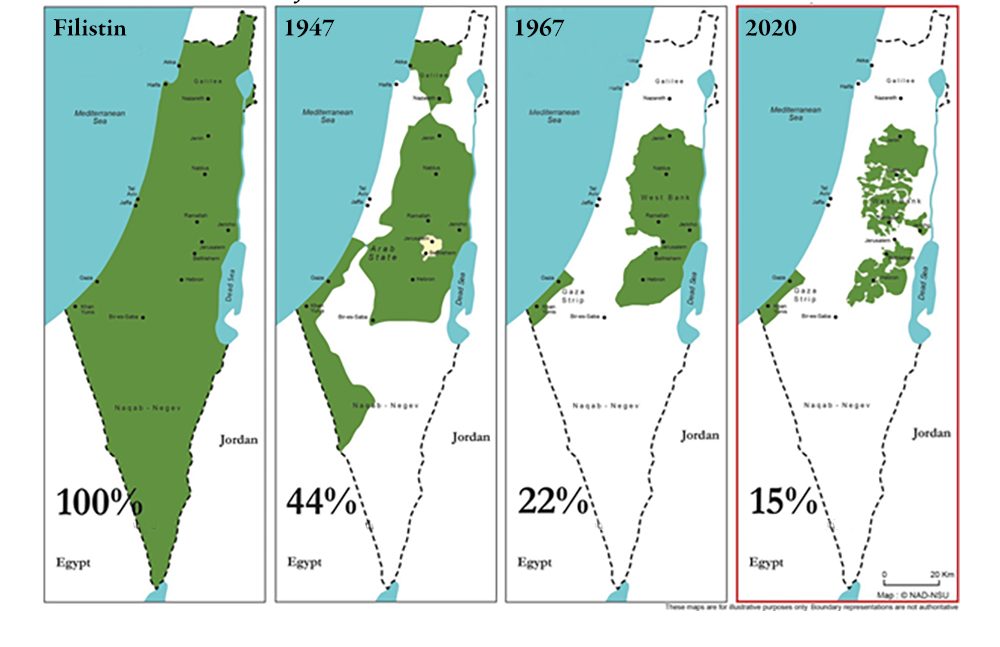 ABD emperyalizminin ileri karakolu İsrail on yıllardır binbir insanlık dışı yöntemle katlederek, Filistin halkının topraklarını ilhak ve işgal ederek  birbiriyle bağı kalmamış iki küçük parça haline getirdi Filistin’i. Bugün Macron’un tartışmaya açtığı, BM’nin de desteklediği ve toplantıların yapıldığı tartışmanın konusu Filistin devleti devlet tanımına uyan bir devlet değildir.