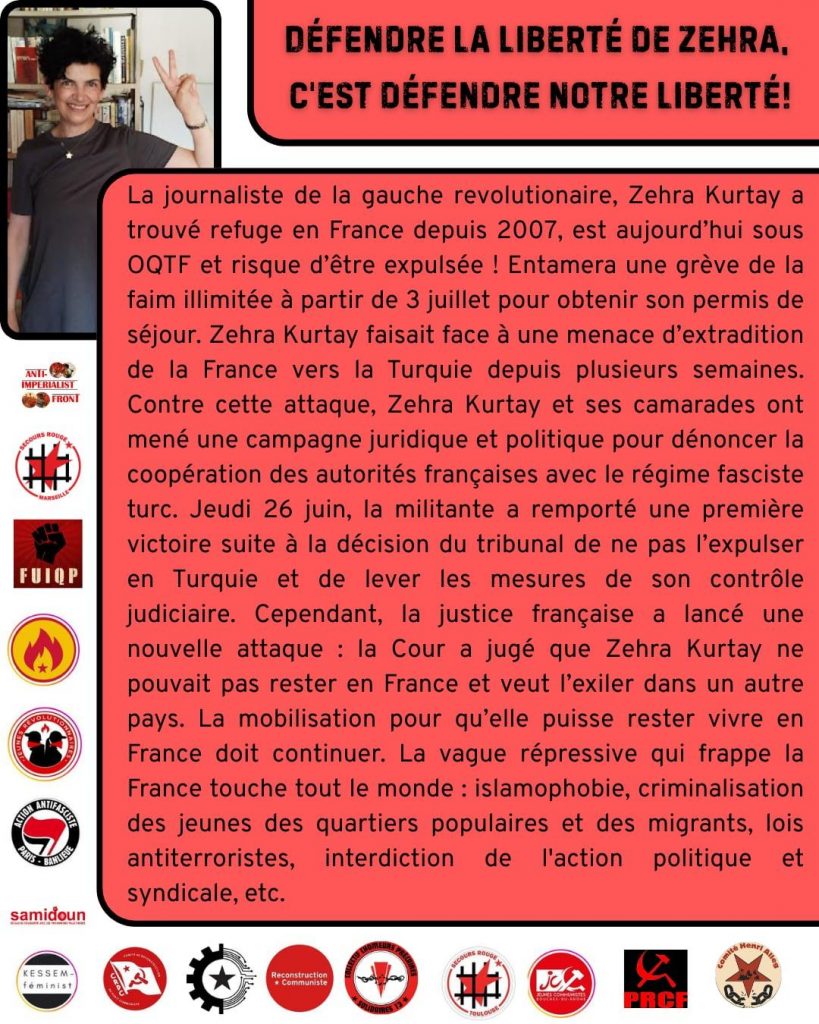 “2007’den beri Fransa’ya sığınan devrimci solcu gazeteci Zehra Kurtay şu anda OQTF’nin gözetimi altında ve sınır dışı edilme riskiyle karşı karşıya! Oturma iznini alabilmek için 3 Temmuz’dan itibaren süresiz açlık grevine başlayacak.