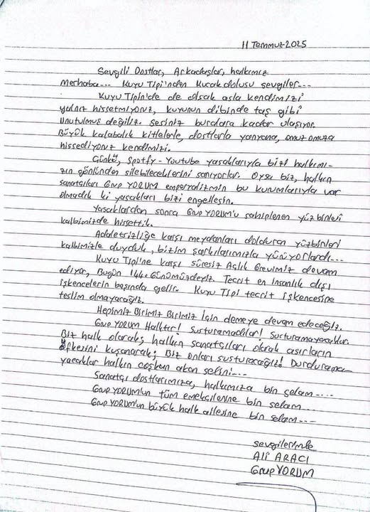 Kuyu tipi hapishaneden yazdığı mektupta Grup Yorum’a uygulanan baskılara, sansürlere değindi. Grup Yorum emekçilerine, Grup Yorum ailesine ve halkımıza selam gönderdiği 11 Temmuz tarihli mektubu yayınlıyoruz :