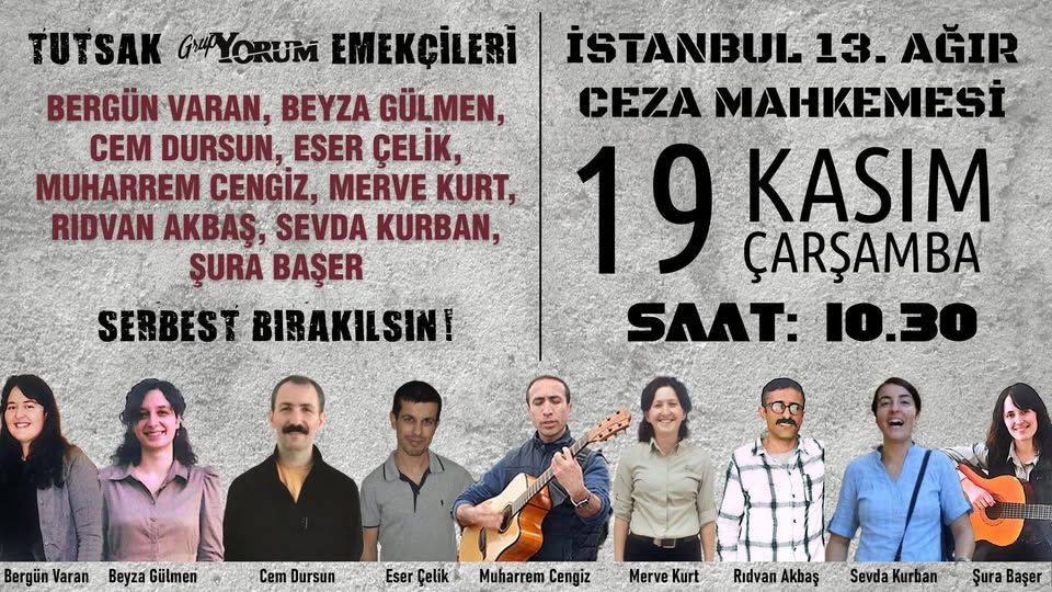Tutsak Grup Yorum emekçileri Bergün Varan, Beyza Gülmen, Cem Dursun, Eser Çelik, Muharrem Cengiz, Merve Kurt, Rıdvan Akbaş, Sevda Kurban, Şura Başer‘in duruşmaları 19 Kasım Çarşamba 10.30’da Çağlayan 13. ACM’de görülecek.