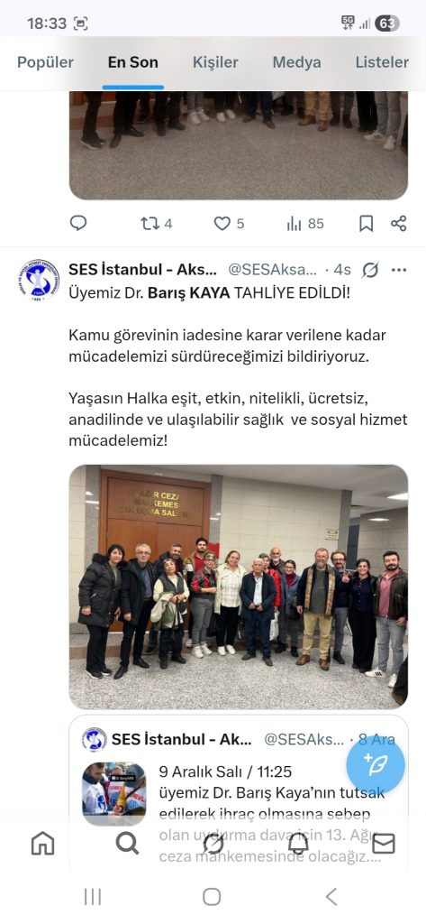 Tahliye ile ilgili duruşmaya katılan SES İstanbul şubesi yaptığı paylaşımda “kamu görevinin iadesine karar verilene kadar mücadelemizi sürdüreceğimizi bildiriyoruz” mesajı verdi.