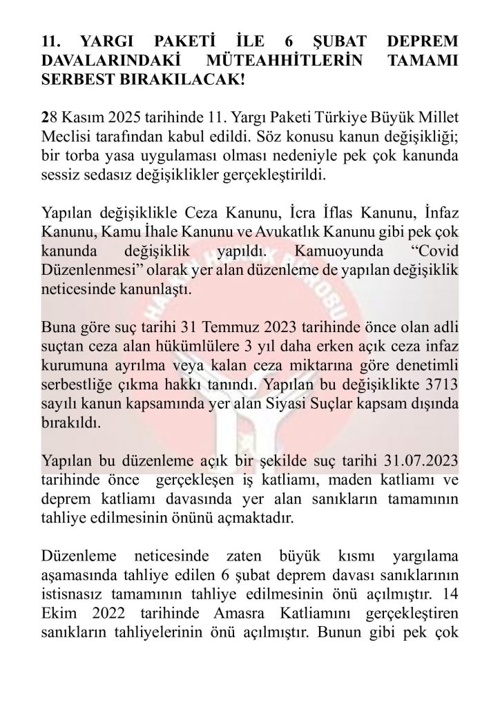 “11. YARGI PAKETİ İLE 6 ŞUBAT DEPREM DAVALARINDAKİ MÜTEAHHİTLER SERBEST BIRAKILACAK!” başlıklı bir açıklama yaptı.