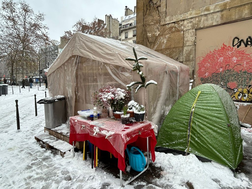 Beyaz bir örtünün altında kaldı Paris direniş çadırı.