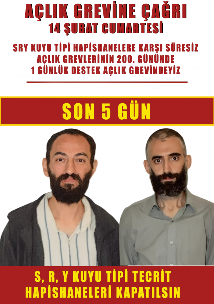 Tüm halkımızı Özgür Tutsakların direnişini sahiplenmeye, Tahsin Sağaltıcı ve Gürkan Türkoğlu’nun direnişlerinin 200. günü olan 14 Şubat Cumartesi günü 1 günlük destek açlık grevi yapmaya, destek videoları çekmeye çağırıyoruz.”