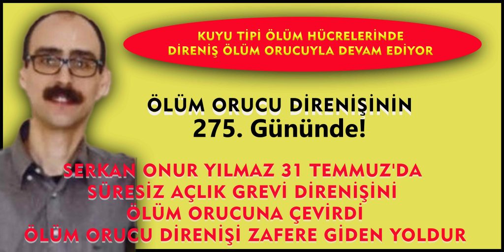 31 Temmuz’da süresiz açlık grevini, ölüm orucuna çevirdiğini açıklayan Serkan Onur Yılmaz, bugün açlığın koynundaki yürüyüşünün 275. gününde.
