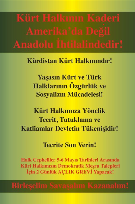 Çağrımız halk saflarında herkesedir. Ekmeğimizi savunmak için birleşip örgütlenelim, adalet için direnip savaşalım, kendi kaderimizi tayin ederek ülkemizin bağımsızlığını kazanalım, devrimci halk iktidarını kuralım.