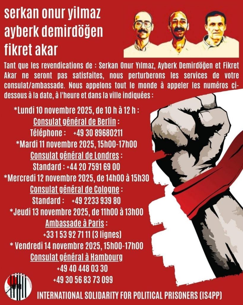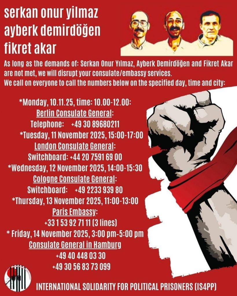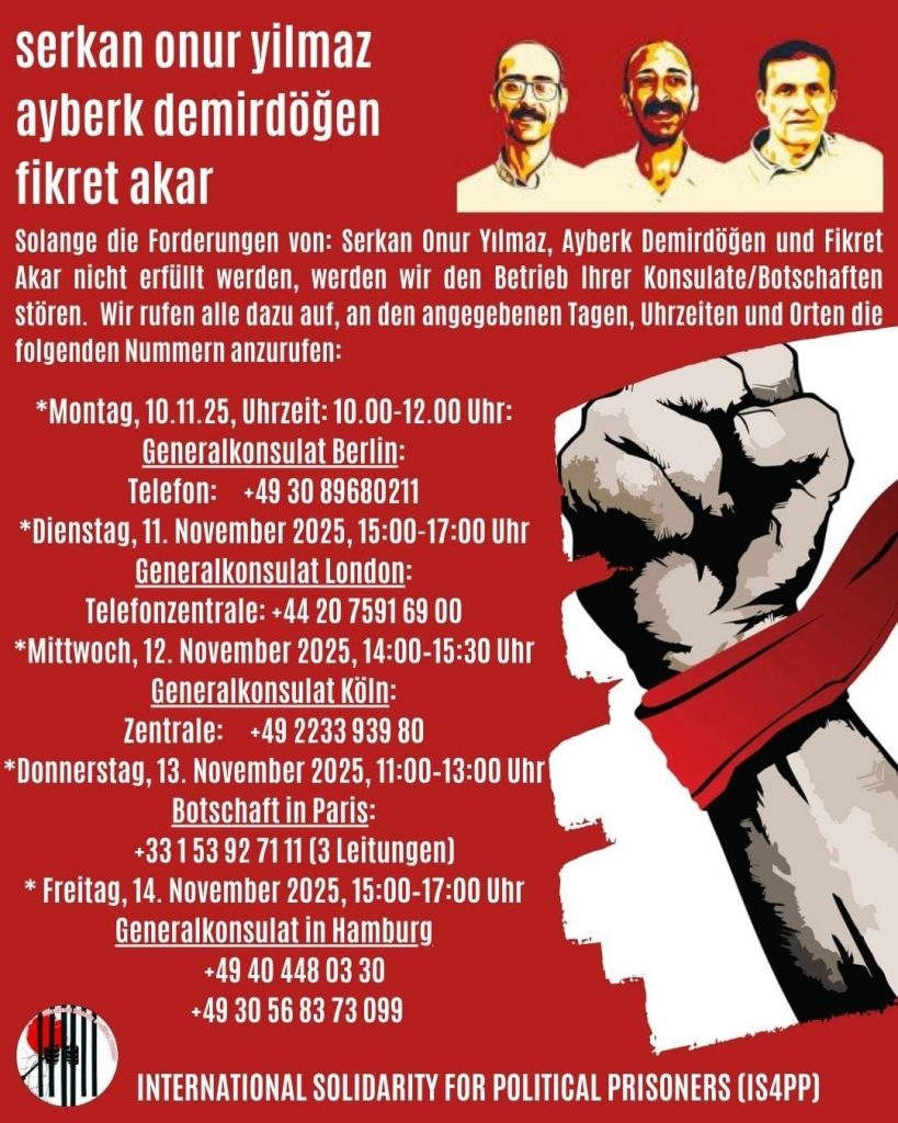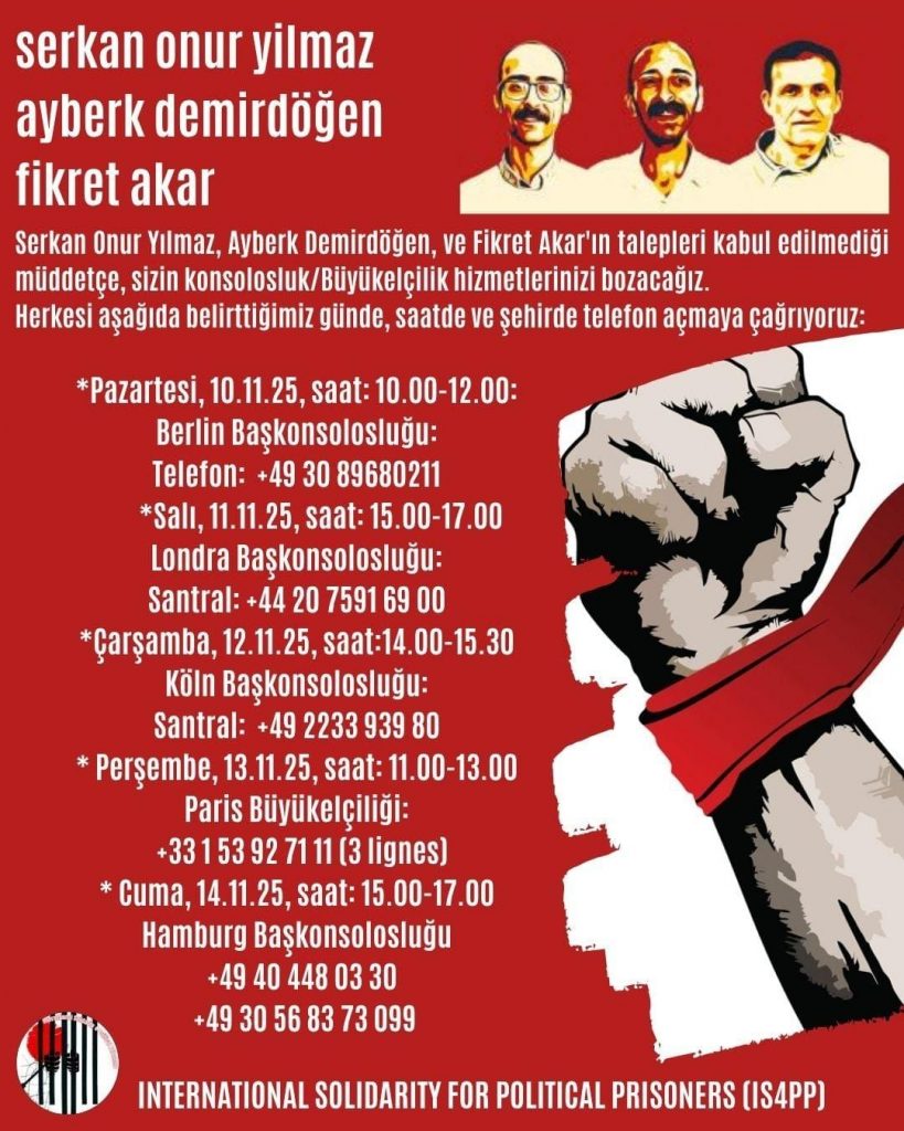 Çağrıda, “önerilen günlerde belirtilen TC konsolosluklarını arayarak ölüm orucu direnişçilerinin taleplerinin kabul edilmesini talep edelim” denildi.