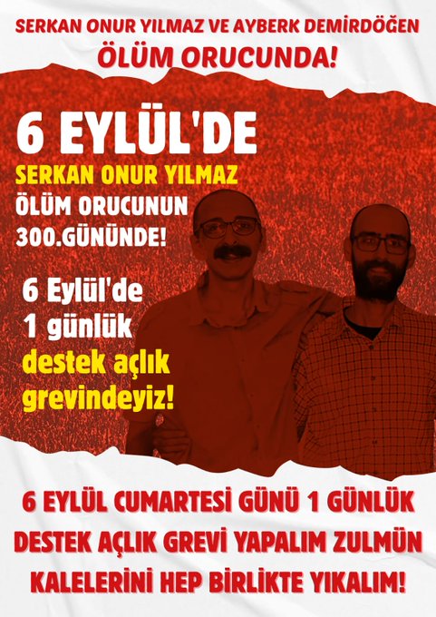 “Ölüm orucu Direnişinin 300. günü olan 6 Eylül tarihinde bizlerde bulunduğumuz her yerde, Serkan’ın ve direnişte olan tüm tutsakların taleplerinin kabul edilmesi için;