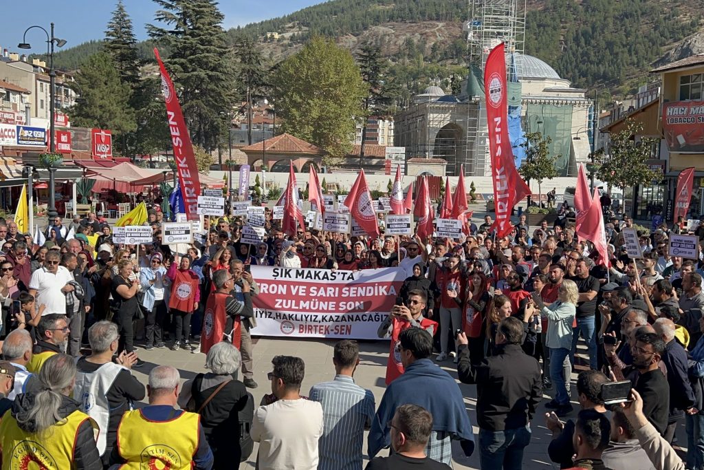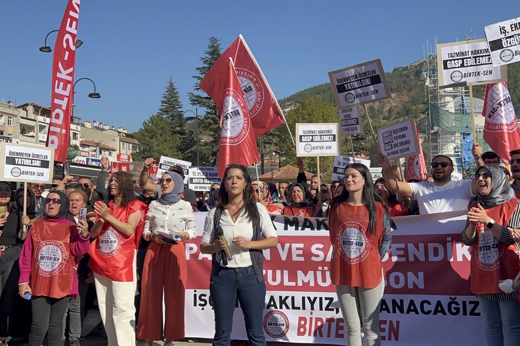 Eylemde Öz-İplik İŞ’in işbirlikçiliği protesto edilerek, “Öz İplik İş dışarı BİRTEK-SEN içeri” sloganını atıldı.