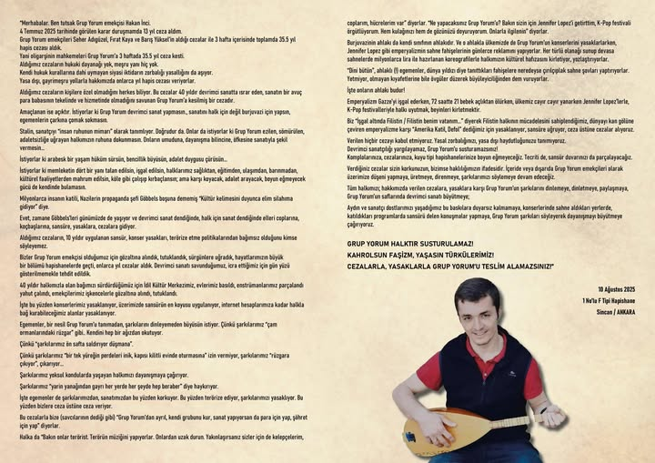 Aydın ve sanatçı dostlarımızı yaşadığımız bu baskılara duyarsız kalmamaya, konserlerinde sahne aldıkları yerlerde, katıldıkları programlarda sansürü delen konuşmalar yapmaya, Grup Yorum şarkıları söyleyerek dayanışmayı büyütmeye çağırıyoruz.