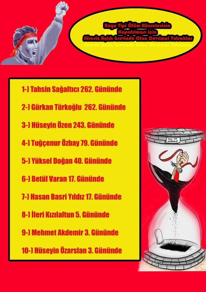 - Sincan 1 Nolu F Tipi Hapishasi’nde tutulan Grup Yorum Emekçisi Hakan İnci, “Kuyu Tipi” Tecrit İşkencesine Karşı 260 Gündür Açlıklarıyla Direnen Devrimci Tutsakların Taleplerinin Kabul Edilmesi İçin 15 Günlük Destek Açlık Grevine Başladı.