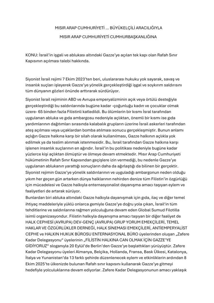 Zafere Kadar Delegasyonu Mısır Konsolosluklarına ve Büyükelçiliklerine dilekçeler gönderilerek, Rafah sınır kapısının açılması talebini güçlü bir biçimde dile getirmeyi öneriyor.