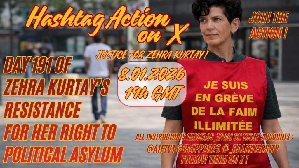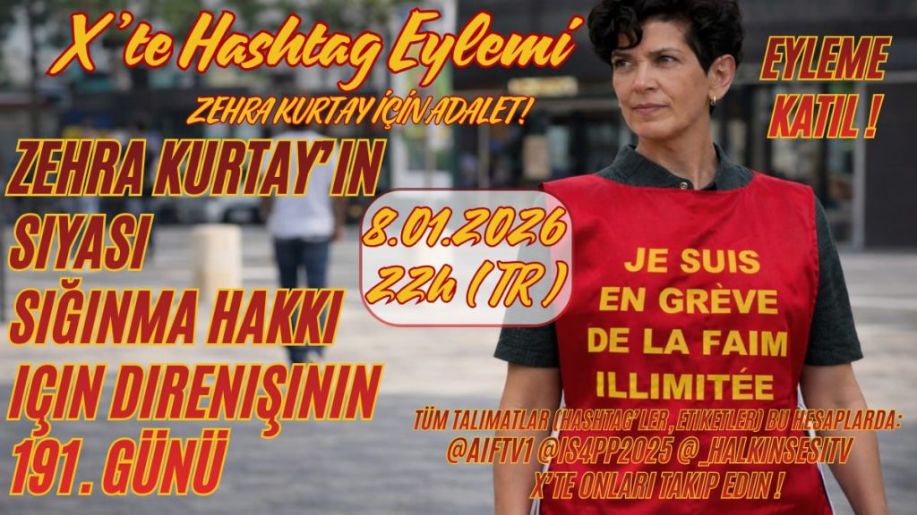 Zehra Kurtay’ın direnişinin 191. günü olan 8 Ocak akşamı için Fransa hedefli bir hashtag eylemi gerçekleştirilecek.